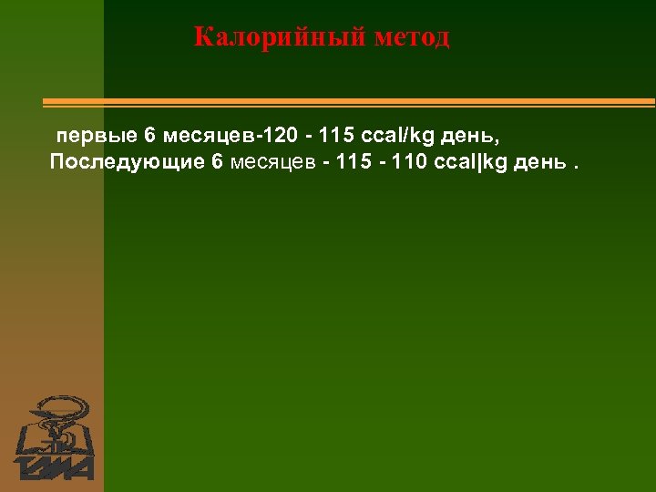Калорийный метод первые 6 месяцев-120 - 115 ccal/kg день, Последующие 6 месяцев - 115 - 110 ccal|kg день.