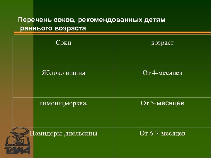Перечень соков, рекомендованных детям раннього возраста Соки возраст Яблоко вишня От 4 -месяцев лимоны, морква. От 5 -месяцев Помидоры , апельсины От 6 -7 -месяцев