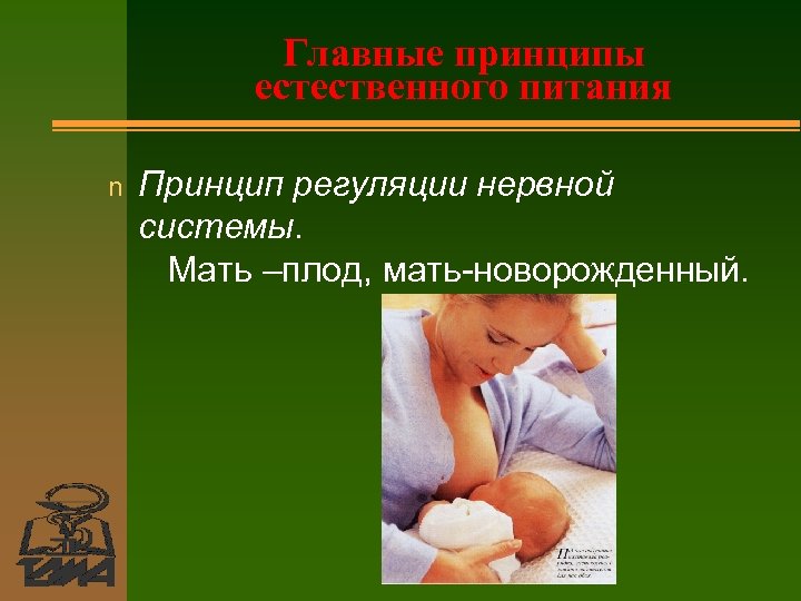 Главные принципы естественного питания n Принцип регуляции нервной системы. Мать –плод, мать-новорожденный.