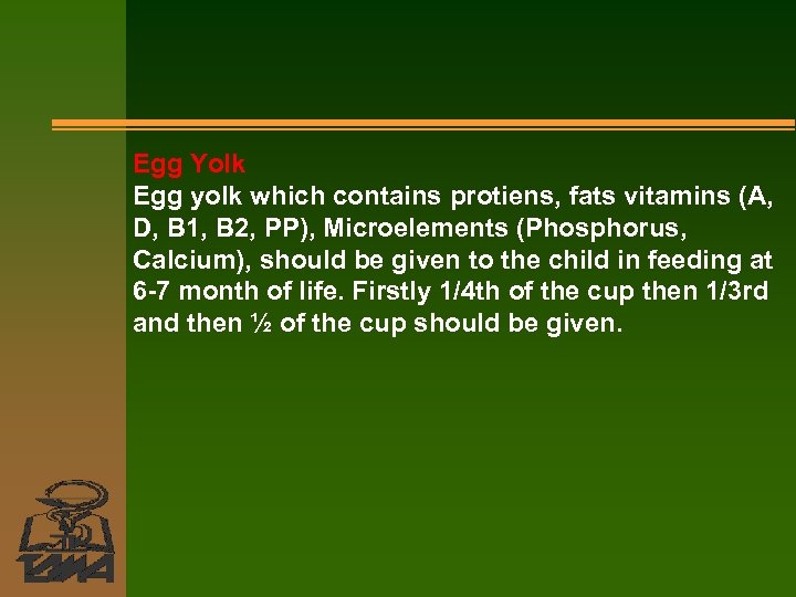 Egg Yolk Egg yolk which contains protiens, fats vitamins (A, D, В 1, В 2, PP), Microelements (Phosphorus, Calcium), should be given to the child in feeding at 6 -7 month of life. Firstly 1/4 th of the cup then 1/3 rd and then ½ of the cup should be given.