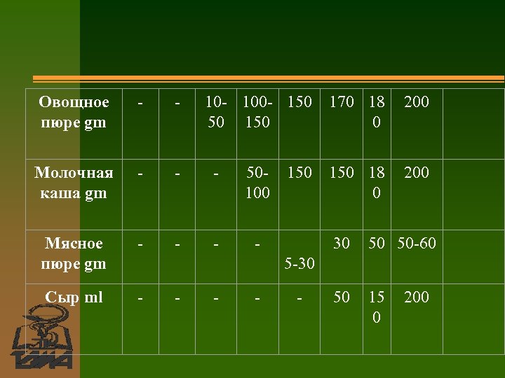 Овощное пюре gm - - 100 - 150 170 18 50 150 0 Молочная каша gm - - - Мясное пюре gm - - - Сыр ml - 50 - 150 18 100 0 - 200 30 50 50 -60 50 15 0 5 -30 - - 200