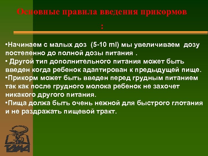 Основные правила введения прикормов : • Начинаем с малых доз (5 -10 ml) мы увеличиваем дозу постепенно до полной дозы питания. • Другой тип дополнительного питания может быть введен когда ребенок адаптирован к предыдущей пище. • Прикорм может быть введен перед грудным питанием так как после грудного молока ребенок не захочет никакого другого питания. • Пища должа быть очень нежной для быстрого глотания и не раздражать пищевой тракт.