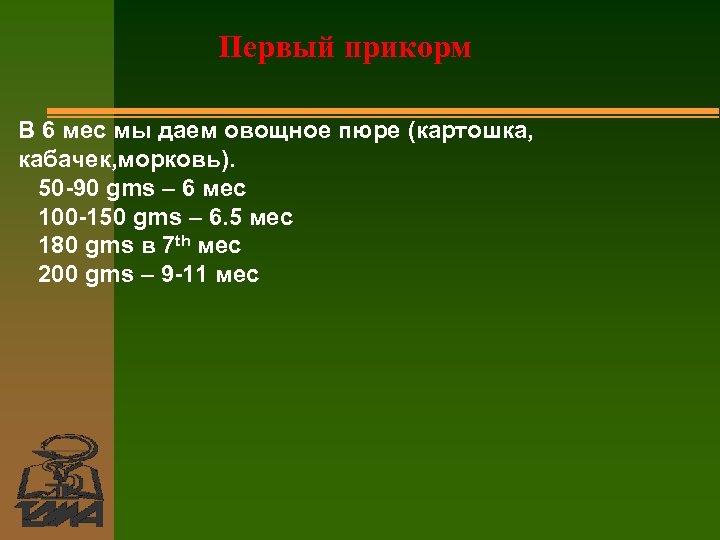 Первый прикорм В 6 мес мы даем овощное пюре (картошка, кабачек, морковь). 50 -90 gms – 6 мес 100 -150 gms – 6. 5 мес 180 gms в 7 th мес 200 gms – 9 -11 мес