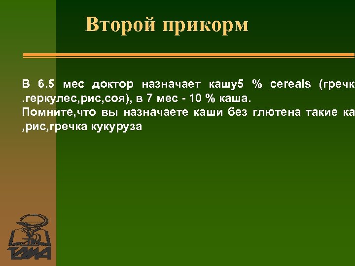 Второй прикорм В 6. 5 мес доктор назначает кашу5 % cereals (гречка. геркулес, рис, соя), в 7 мес - 10 % каша. Помните, что вы назначаете каши без глютена такие ка , рис, гречка кукуруза