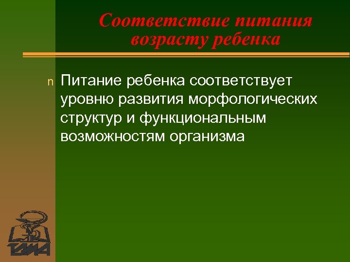 Соответствие питания возрасту ребенка n Питание ребенка соответствует уровню развития морфологических структур и функциональным возможностям организма