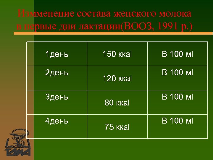 Измменение состава женского молока в первые дни лактации(ВООЗ, 1991 р. ) 1 день 2 день 3 день 4 день 150 ккаl 120 ккаl 80 ккаl 75 ккаl В 100 мl