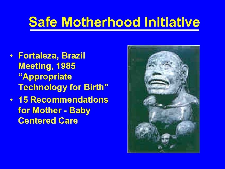 Safe Motherhood Initiative • Fortaleza, Brazil Meeting, 1985 “Appropriate Technology for Birth” • 15 Recommendations for Mother - Baby Centered Care