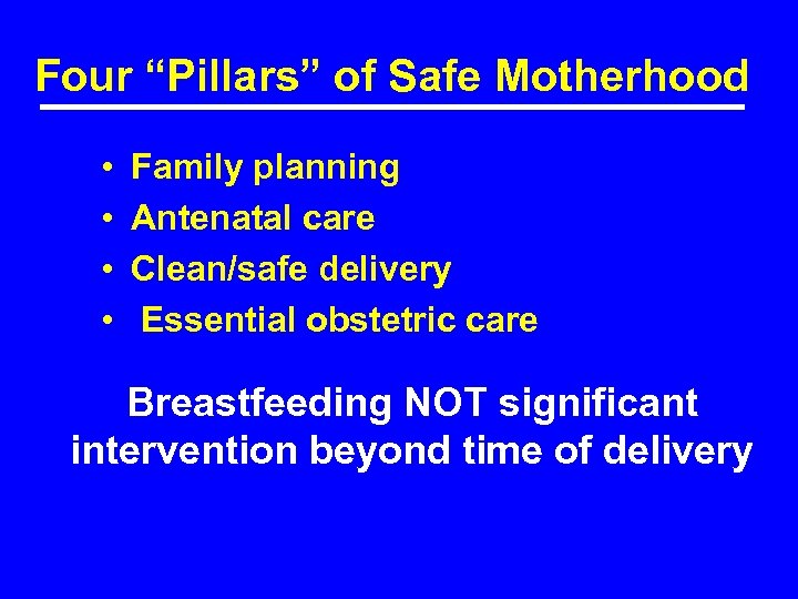 Four “Pillars” of Safe Motherhood • • Family planning Antenatal care Clean/safe delivery Essential obstetric care Breastfeeding NOT significant intervention beyond time of delivery