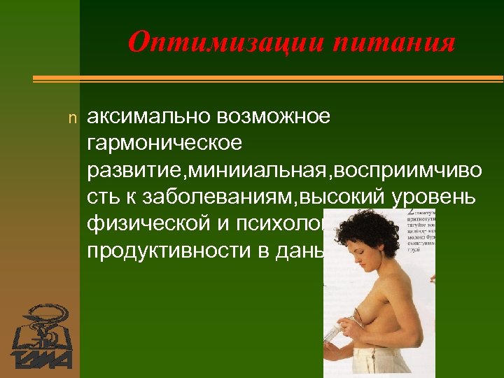 Оптимизации питания n аксимально возможное гармоническое развитие, минииальная, восприимчиво сть к заболеваниям, высокий уровень физической и психологической продуктивности в даный период