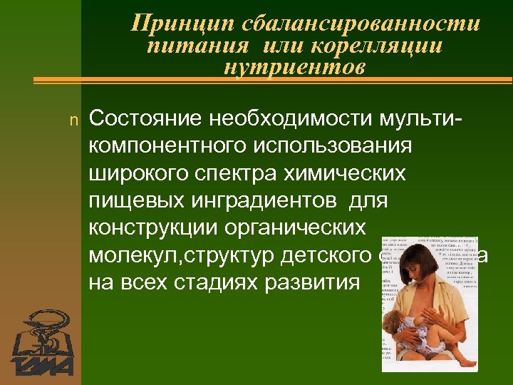 Принцип сбалансированности питания или корелляции нутриентов n Состояние необходимости мультикомпонентного использования широкого спектра химических пищевых инградиентов для конструкции органических молекул, структур детского организма на всех стадиях развития