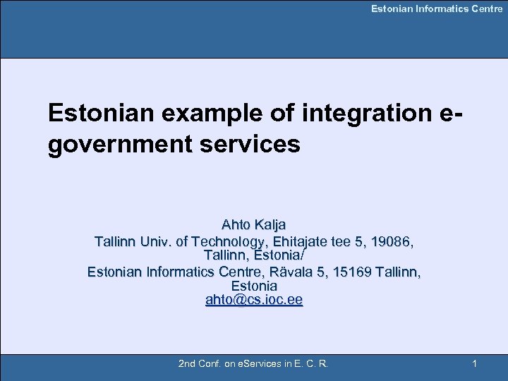 Estonian Informatics Centre Estonian example of integration egovernment services Ahto Kalja Tallinn Univ. of Technology, Ehitajate tee 5, 19086, Tallinn, Estonia/ Estonian Informatics Centre, Rävala 5, 15169 Tallinn, Estonia ahto@cs. ioc. ee 2 nd Conf. on e. Services in E. C. R. 1