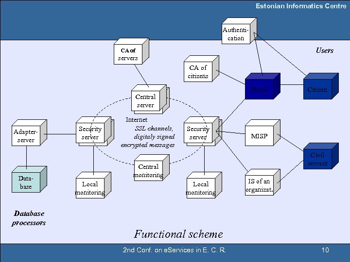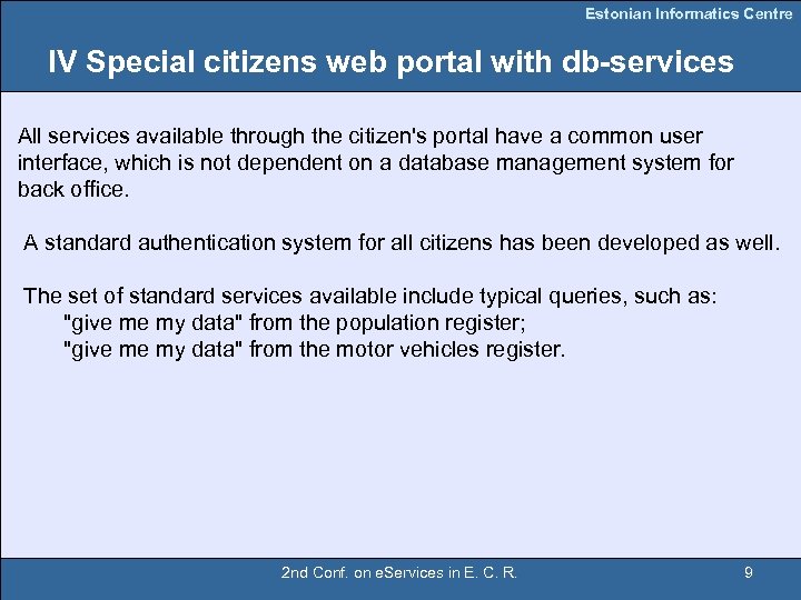 Estonian Informatics Centre IV Special citizens web portal with db-services All services available through the citizen's portal have a common user interface, which is not dependent on a database management system for back office. A standard authentication system for all citizens has been developed as well. The set of standard services available include typical queries, such as: "give me my data" from the population register; "give me my data" from the motor vehicles register. 2 nd Conf. on e. Services in E. C. R. 9