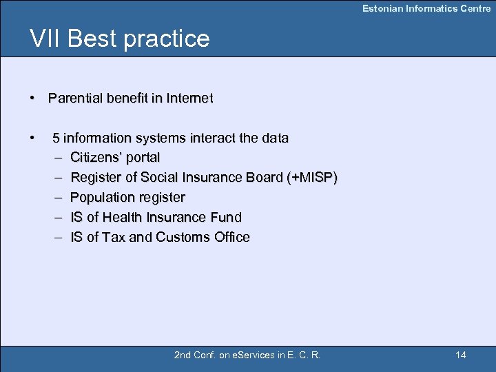 Estonian Informatics Centre VI e. Services The set of facilities for the IS, which are joined to the X-Road environment: • Authentication (ID-card + 5 Internet bank services); • Authorization; • MISP (Mini Info System Portal) portal services; • Simple queries to Estonian national databases; • The facilities for developing complex business model queries (queries to different databases and registers); • The writing operation into databases; • The facility to send large amount of data (over 10 Mb) from database to database over the Internet; • Secure data exchange, logs storing; • Queries surveillance possibility; • The integration with citizen portal for adding new services; • The integration with entrepreneurs portal for adding new services; • Central and local monitoring; • The special database for storing services WSDL descriptions. 2 nd Conf. on e. Services in E. C. R. 13