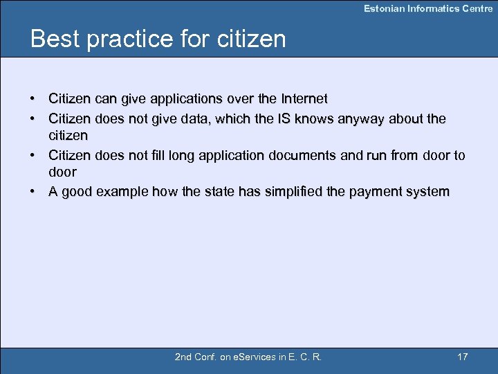 Estonian Informatics Centre e. Services • • • e. Police e. Health e. Elections … Internet-banking 2 nd Conf. on e. Services in E. C. R. 16