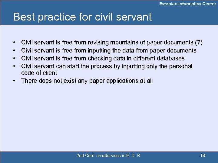 Estonian Informatics Centre Best practice for civil servant • • Civil servant is free from revising mountains of paper documents (7) Civil servant is free from inputting the data from paper documents Civil servant is free from checking data in different databases Civil servant can start the process by inputting only the personal code of client • There does not exist any paper applications at all 2 nd Conf. on e. Services in E. C. R. 18