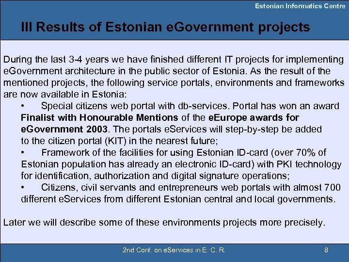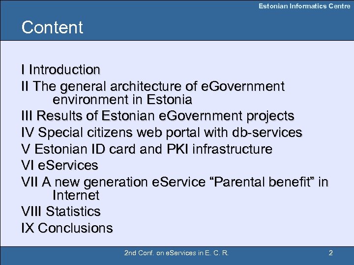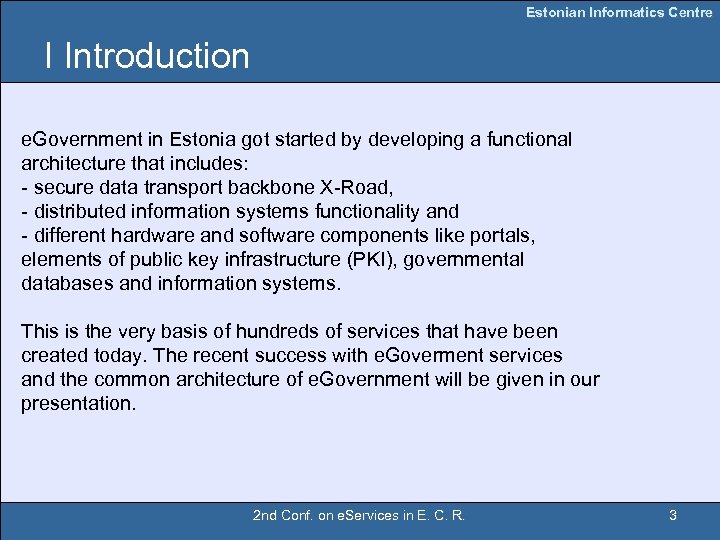 Estonian Informatics Centre Content I Introduction II The general architecture of e. Government environment in Estonia III Results of Estonian e. Government projects IV Special citizens web portal with db-services V Estonian ID card and PKI infrastructure VI e. Services VII A new generation e. Service “Parental benefit” in Internet VIII Statistics IX Conclusions 2 nd Conf. on e. Services in E. C. R. 2