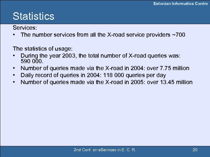 Estonian Informatics Centre VIII Statistics At the moment we have following clients: • Organizations: Number of agreements – ~366 Databases/Service providers: • All service providers: 69 Security servers: • Number of agreements for SS: 80 2 nd Conf. on e. Services in E. C. R. 19