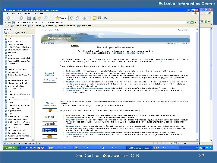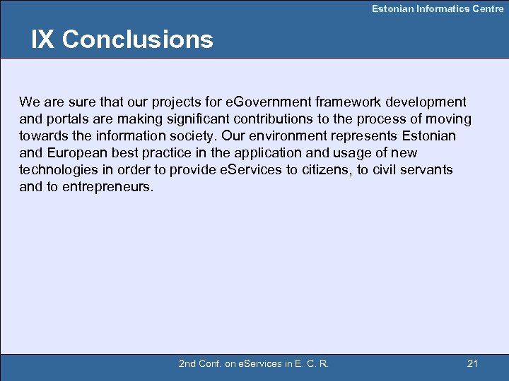 Estonian Informatics Centre IX Conclusions We are sure that our projects for e. Government framework development and portals are making significant contributions to the process of moving towards the information society. Our environment represents Estonian and European best practice in the application and usage of new technologies in order to provide e. Services to citizens, to civil servants and to entrepreneurs. 2 nd Conf. on e. Services in E. C. R. 21