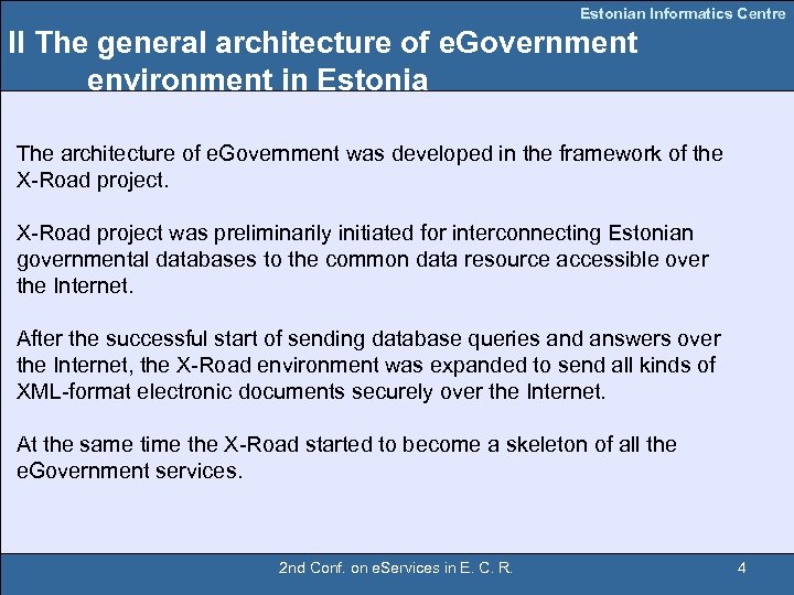 Estonian Informatics Centre I Introduction e. Government in Estonia got started by developing a functional architecture that includes: - secure data transport backbone X-Road, - distributed information systems functionality and - different hardware and software components like portals, elements of public key infrastructure (PKI), governmental databases and information systems. This is the very basis of hundreds of services that have been created today. The recent success with e. Goverment services and the common architecture of e. Government will be given in our presentation. 2 nd Conf. on e. Services in E. C. R. 3