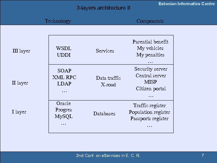Estonian Informatics Centre 3 -layers architecture I Services Data transport X-road Databases 2 nd Conf. on e. Services in E. C. R. 6