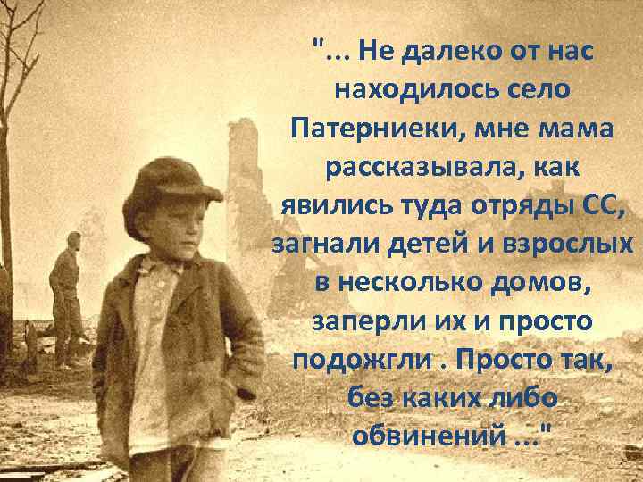 ". . . Не далеко от нас находилось село Патерниеки, мне мама рассказывала, как явились туда отряды СС, загнали детей и взрослых в несколько домов, заперли их и просто подожгли. Просто так, без каких либо обвинений. . . "