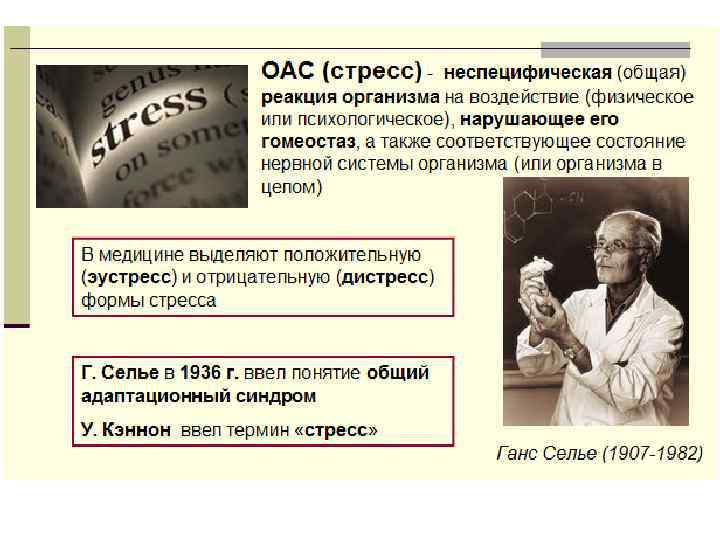Адаптационный синдром (Г. Селье) 1907 - 1982 • совокупность общих защитных реакций, возникающих в организме животных и человека при действии значительных по силе и продолжительности внешних и внутренних раздражителей.