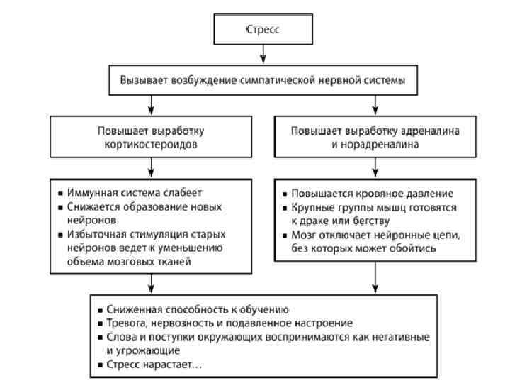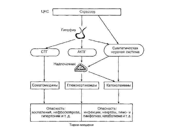 Фазы адаптационного синдрома 1 -я — стадия тревоги (мобилизация адаптационных возможностей — возможности эти ограничены), продолжается от 6 до 48 часов и делится на фазы шока и противошока; на этой стадии усиливаются выработка и поступление в кровь гормонов надпочечников — глюкокортикоидов и адреналина, организм перестраивается, приспосабливается к трудным условиям, 2 -я — стадия резистентности (сопротивляемости), когда устойчивость организма к различным воздействиям повышена; к концу этой стадии состояние организма нормализуется и происходит выздоровление. Если действие раздражителей велико по силе и продолжительности, то наступает 3 -я стадия — стадия истощения, которая может завершиться гибелью организма.