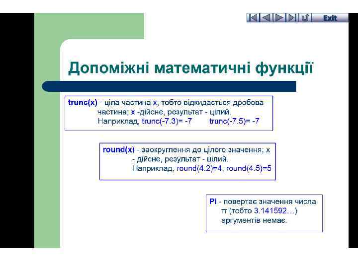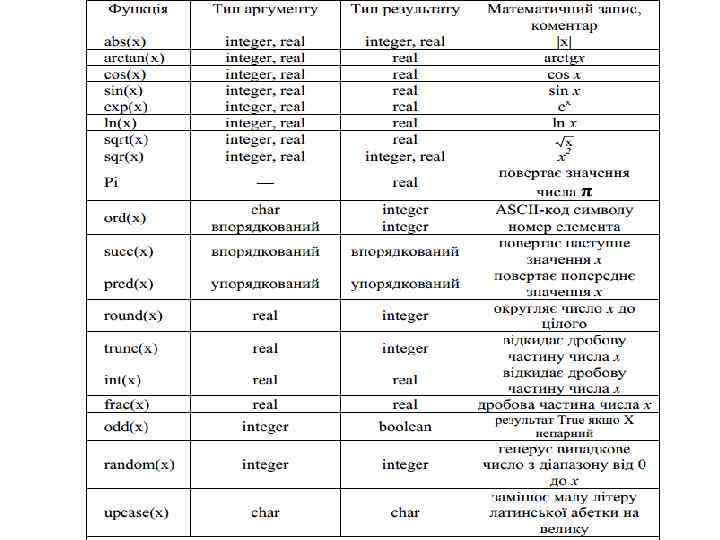 Подання деяких математичних та тригонометричних функцій, що обчислюються через додаткові вирази: Logyx ln(X)/ln(Y) Lg X ln(X)/ln(10) Tg X sin(X)/cos(X) Ctg X cos(X)/sin(X) Arcsin X arctan(X/sqrt(1 -sqr(X))) Arccos X arctan((1 -sqr(X))/X) Arcctg X 1/arctan(X)