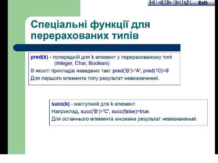Рядкові величини Рядок – це послідовність символів кодової таблиці комп’ютера. Опис: Var <ідентифікатор>: string [максим довжина рядка]; Операції: з’єднання (+), присвоєння (: =), порівняння, введення-виведення. Функції 1. Length (A) – довжина рядка Процедури 1. Insert (A, B, p) – вставка рядка А у рядок В, починаючи з позиції номером р 2. Copy (R, Poz, N) –копіює фрагмент довжиною N рядка R з позиції Poz 3. Pos (A, B) –дає номер символу, з якого починається входження рядка А у рядок В 4. Concat (A, B, …) – з’єднує рядки в один рядок 2. Delete (B, p, m) – вилучає m символів з рядка В, починаючи від позиції р 3. Str (C, B) – переводить числове дане С у дане В типу рядок 4. Val (A, C, D) – засилає у числову змінну С числовий образ рядка А