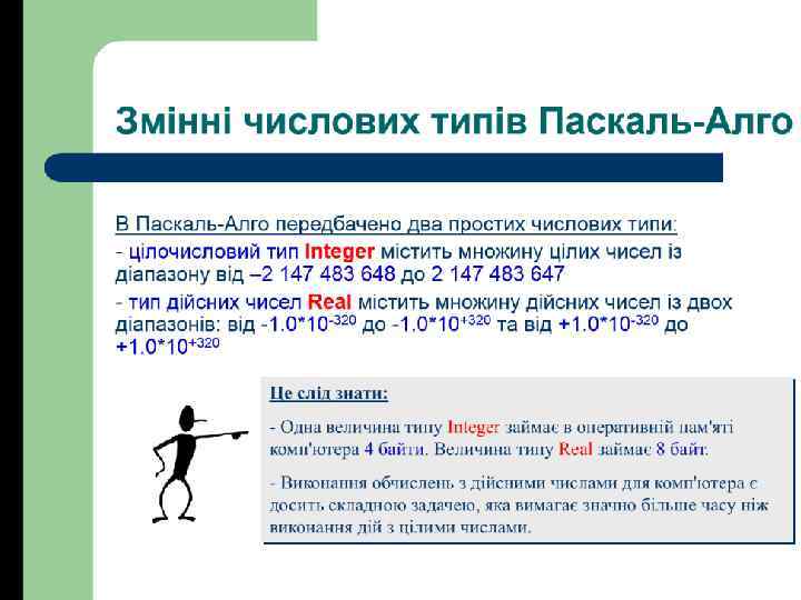 Типи даних Це множина значень однакової природи разом із набором операцій, які над ними виконуються. Цілий integer Дійсний real (-32768… 32767) таблиця) Операції: +, -, *, /, div, mod (29 Е-39… 1. 7 Е 38) Операції: +, -, *, / Булевий Рядковий boolean string (true, false) (0 – 255 байт) Літерний char (кодова