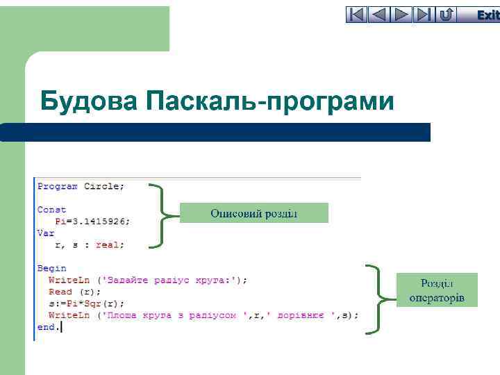 Загальний вигляд програми: program <Ім'я програми>; const <Список постійних значень>; var <Опис використовуваних змінних>; begin <Оператор 1>; <Оператор 2>; . . . <Оператор N> end.