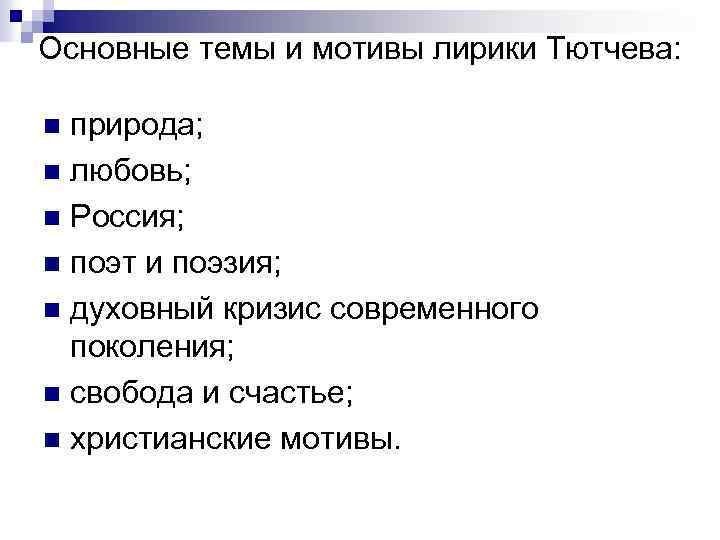 Основные темы и мотивы лирики Тютчева: природа; n любовь; n Россия; n поэт и поэзия; n духовный кризис современного поколения; n свобода и счастье; n христианские мотивы. n