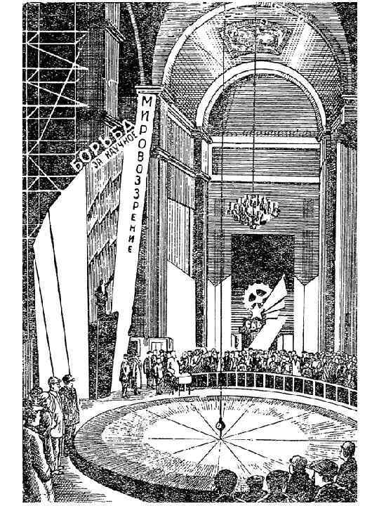 МАЯТНИК ФУКО в начале рассказа экскурсовод ставил на внешнюю окружность брусок в нескольких сантиметров от того места, где шар пересекал окружность. За время рассказа расстояние между бруском и наконечником шара неизменно сокращалось. Наконец, под удовлетворённые возгласы брусок падал, сбитый при очередном пролёте шара. Шар весил 54 кг. За 1 час Земля поворачивается на 13 градусов относительно плоскости качания маятника» . Это верно для ~60 градусов северной широты Санкт -Петербурга в соответствии с математической теорией маятника.