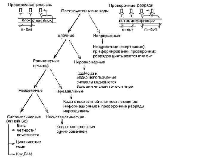 Существующие помехоустойчивые коды можно разделить на ряд групп, только часть из которых применяются для обнаружения ошибок в передаваемых по сети пакетах. В группе систематических (линейных) кодов общим свойством является то, что любая разрешенная комбинация может быть получена в результате линейных операций над линейно-независимыми векторами. Это способствует упрощению аппаратной и программной реализации данных кодов, повышает скорость выполнения необходимых операций. Простейшими систематическими кодами являются биты четности/нечетности. Они не позволяют обнаружить ошибки четной кратности (то есть ошибки одновременно в двух, четырех и т. д. битах) и поэтому используются при невысоких требованиях к верности принимаемых данных (или при малой вероятности ошибок в линии передачи). Примером может служить бит Parity (соответствие) в установках режимов работы последовательного порта с помощью команды MODE (MS DOS). Несмотря на ограниченные возможности обнаружения ошибок, биты четности / нечетности имеют большое значение в теории помехоустойчивого кодирования. Одни из первых математически обоснованных и практически использованных ранее для защиты информации в запоминающих устройствах помехоустойчивых кодов – коды Хэмминга представляют собой простую совокупность перекрестных проверок на четность/нечетность. Циклические коды могут рассматриваться как обобщенные проверки на четность/ нечетность.