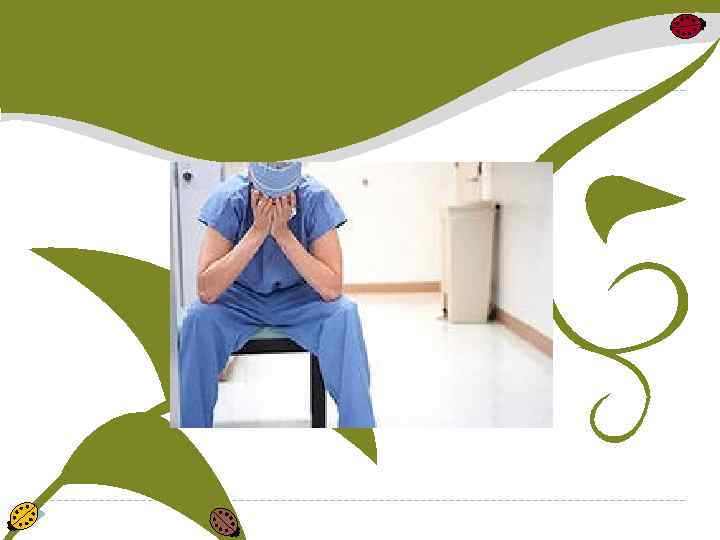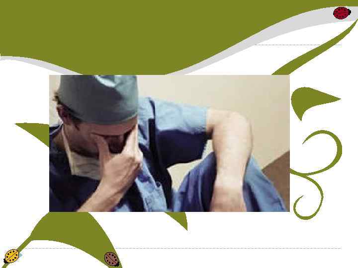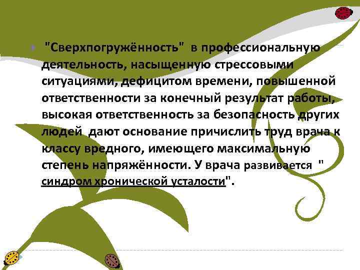 "Сверхпогружённость" в профессиональную деятельность, насыщенную стрессовыми ситуациями, дефицитом времени, повышенной ответственности за конечный результат работы, высокая ответственность за безопасность других людей дают основание причислить труд врача к классу вредного, имеющего максимальную степень напряжённости. У врача развивается " синдром хронической усталости".