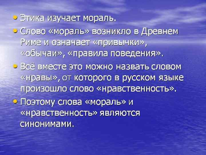 Понятия «мораль» и «нравственность» Мораль – форма общественного сознания; нравственность – сфера практических поступков человека. Мораль – приземленные, исторически изменчивые нормы поведения; нравственность – высокие основополагающие принципы. В этом случае, например, заповеди бога именуются нравственными, а наставления школьного учителя – моральными. Мораль – то, какими видятся поступки индивиду в его субъективных оценках, умыслах, переживаниях вины, а нравственность – то, какими на самом деле являются поступки человека в реальном опыте жизни семьи, народа, государства.
