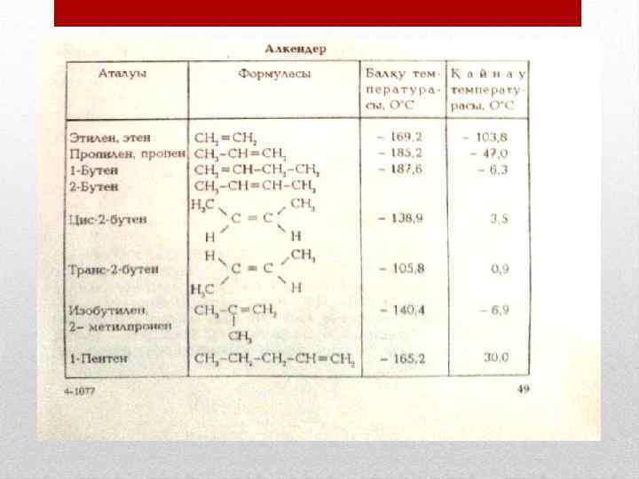 Физикалық қасиеттері. Этилен көмірсутектері гомологтық қатарының бастапқы үш өкілі газ тәріздес пентеннен С 17 алкенге дейінгі олефиндер сұйықтар, одан әрі қарай қатты (7 кесте) болып табылады. Молекулалық масса лары өскен сайын балқу және қайнау температуралары артады. Көміртек атомдары нормалды тізбекті олефиндер өздерінің тармақталған тізбекті изомерлерінен гөрі жоға рырақ температурада қайнайды. Цис изомерлер әдетте Цис изомерлер трас изомерлерден гөрі жоғарырақ температурада қайнай ды, ал балқу температуралары керісінше. Алкендердің суда ерігіштігі тіпті аз, олардың тыгыздықтары бірден кем және гомологтық қатарда тығыздықтары артады.