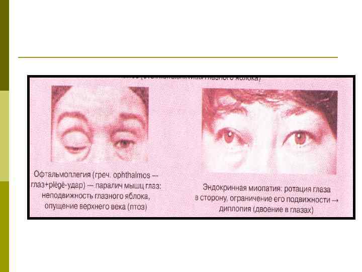 Проявления гипертиреоза p p p Характерными для выраженных форм гипертиреозов являются: Психоневрологические особенности: неустойчивость настроения, повышенная раздражительность, чувство беспокойства, необоснованного страха, возбужденная речь, психастения. Наблюдается тремор пальцев рук, языка; нередко дрожание всего тела, мышечная слабость. Отмечается ↑ потливость. Нарушения ЖКТ (↑ аппетита, понос, тошнота). Больные теряют массу тела; в тяжелых случаях - кахексия (ТГ способствуют мобилизации жира из депо, их окислению и тормозят липогенез из углеводов). Гипертиреоз сопровождается ↑ основного обмена, умеренной гипертермией, чувством жара и жажды. Закономерны нарушения деятельности ССС. Постоянный признак - тахикардия (до 120– 150 и > ударов в мин); в тяжелых случаях → пароксизмальная или постоянная тахисистолическая форма мерцания предсердий. При длительном гипертиреозе развивается симптомокомплекс, получивший название «тиреотоксическое сердце» . Глазные симптомы. Нарушения функции половых жедез- ♀: олиго-, аменорея, у ♂: снижение либидо, потенции.