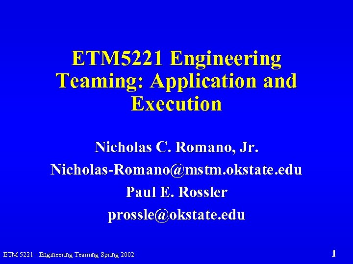 ETM 5221 Engineering Teaming: Application and Execution Nicholas C. Romano, Jr. Nicholas-Romano@mstm. okstate. edu Paul E. Rossler prossle@okstate. edu ETM 5221 - Engineering Teaming Spring 2002 1