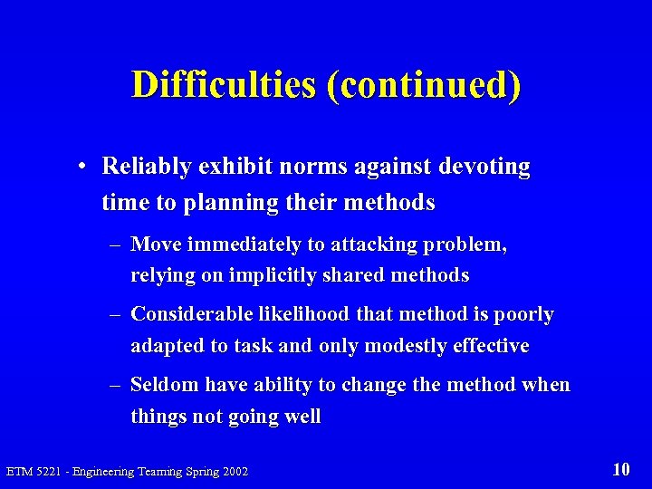 Difficulties (continued) • Reliably exhibit norms against devoting time to planning their methods – Move immediately to attacking problem, relying on implicitly shared methods – Considerable likelihood that method is poorly adapted to task and only modestly effective – Seldom have ability to change the method when things not going well ETM 5221 - Engineering Teaming Spring 2002 10