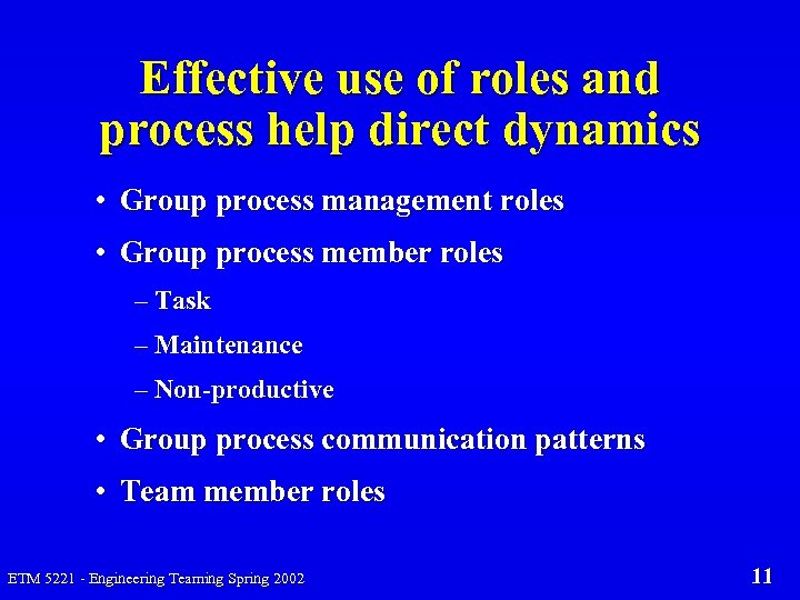 Effective use of roles and process help direct dynamics • Group process management roles • Group process member roles – Task – Maintenance – Non-productive • Group process communication patterns • Team member roles ETM 5221 - Engineering Teaming Spring 2002 11