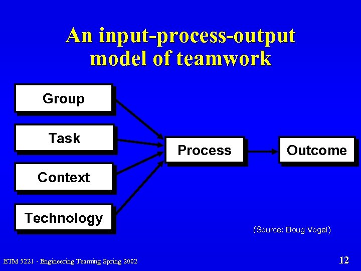 An input-process-output model of teamwork Group Task Process Outcome Context Technology ETM 5221 - Engineering Teaming Spring 2002 (Source: Doug Vogel) 12