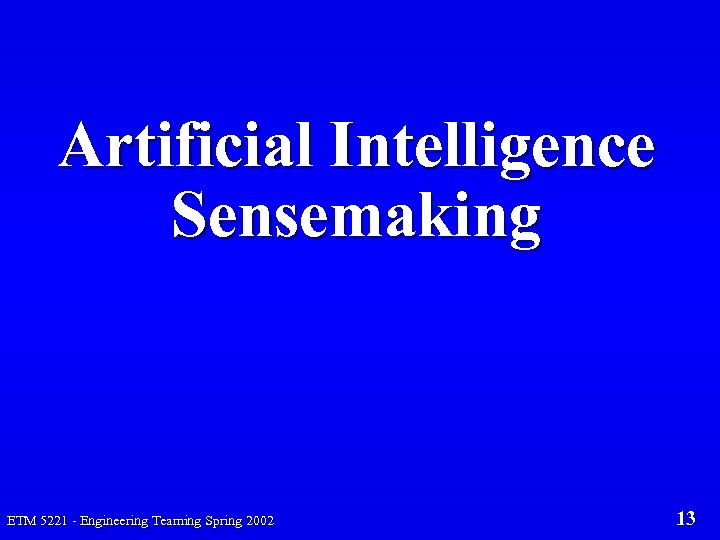 Artificial Intelligence Sensemaking ETM 5221 - Engineering Teaming Spring 2002 13