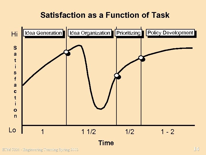 Satisfaction as a Function of Task Hi Idea Generation Idea Organization Prioritizing 1 1 1/2 Policy Development S a t i s f a c t i o n Lo Time ETM 5221 - Engineering Teaming Spring 2002 1 -2 14