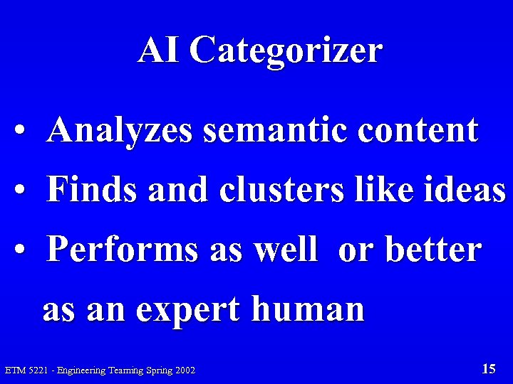 AI Categorizer • Analyzes semantic content • Finds and clusters like ideas • Performs as well or better as an expert human ETM 5221 - Engineering Teaming Spring 2002 15