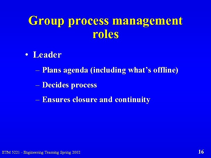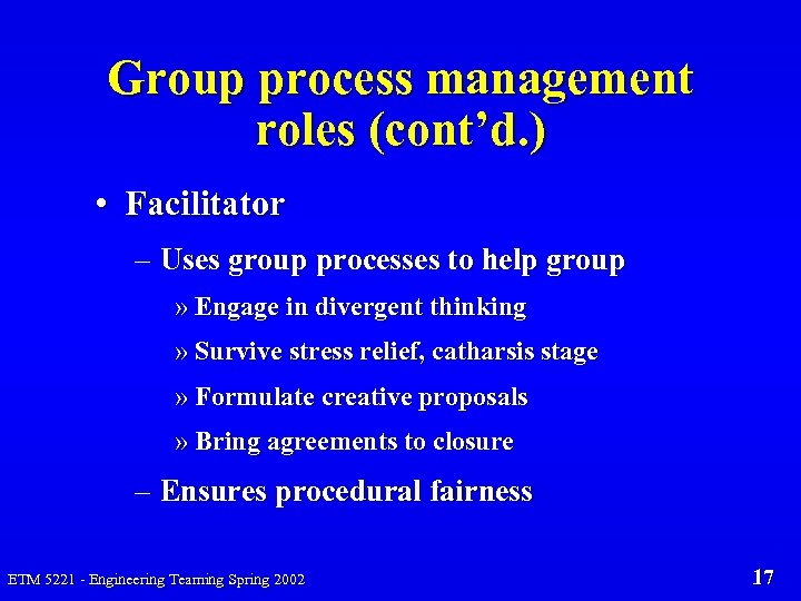 Group process management roles • Leader – Plans agenda (including what’s offline) – Decides process – Ensures closure and continuity ETM 5221 - Engineering Teaming Spring 2002 16