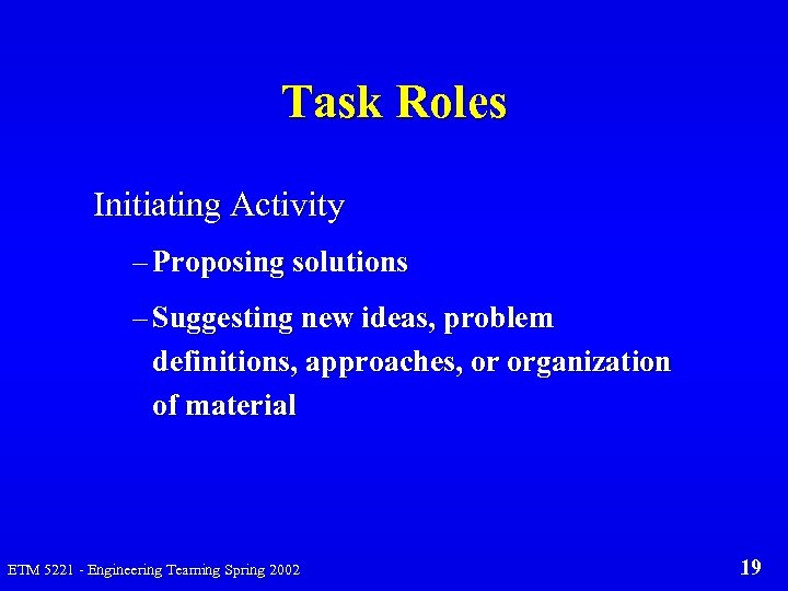 Task Roles Initiating Activity – Proposing solutions – Suggesting new ideas, problem definitions, approaches, or organization of material ETM 5221 - Engineering Teaming Spring 2002 19