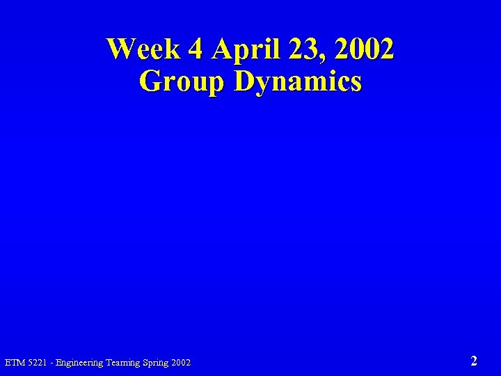 Week 4 April 23, 2002 Group Dynamics ETM 5221 - Engineering Teaming Spring 2002 2