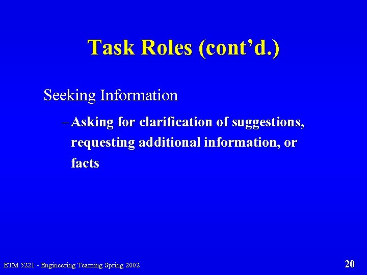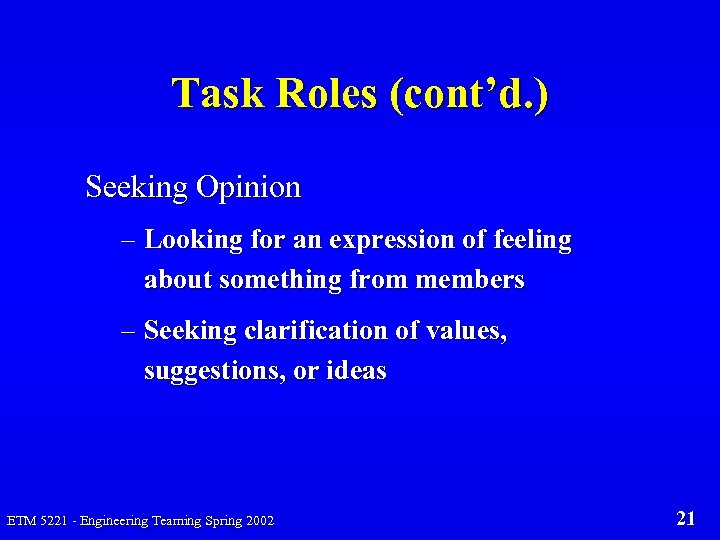 Task Roles (cont’d. ) Seeking Information – Asking for clarification of suggestions, requesting additional information, or facts ETM 5221 - Engineering Teaming Spring 2002 20