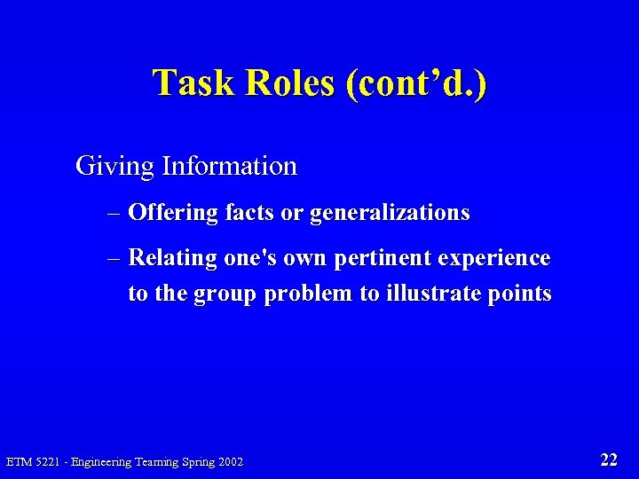 Task Roles (cont’d. ) Seeking Opinion – Looking for an expression of feeling about something from members – Seeking clarification of values, suggestions, or ideas ETM 5221 - Engineering Teaming Spring 2002 21
